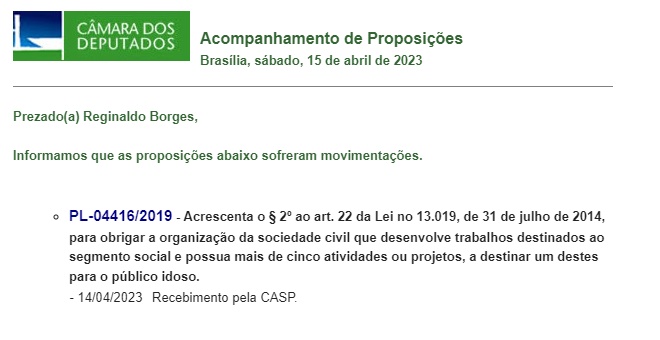 Saiba por onde tramita as Proposições referentes ao segmento da pessoa idosa na Câmara dos Deputados. Lembre-se Idoso conectado é idoso informado. Cobre de seu Deputado uma posição sobre o assunto. Se ele não tem interesse sobre nele, aconselho que está na hora de escolher um deputado que seja solidário a causa do envelhecimento.