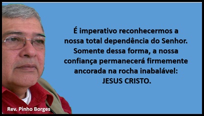 Resumo da Reflexão – A frase é um convite ao descanso mental e espiritual. Ela sugere que a ansiedade e a insegurança surgem quando tentamos carregar o peso do mundo sozinhos. A solução proposta pelo Rev. Pinho Borges é a entrega total (dependência) a Jesus, o que resultaria em uma confiança inabalável, independentemente das situações externas.
