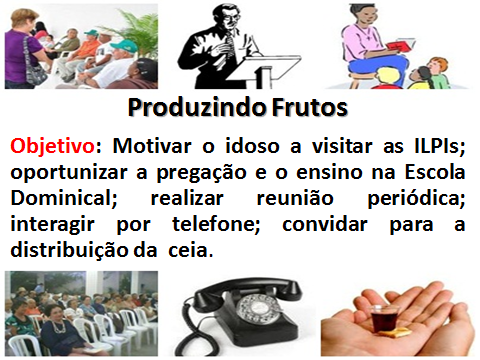 Ferramenta 06 – Produzindo Frutos. O objetivo é motivar a pessoa idosa a visitar as ILPIs; oportunizar a pregação e o ensino na Escola Dominical; realizar reunião periódica; interagir por telefone; convidar para a distribuição da ceia.