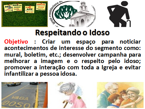 Ferramenta 05 – Respeitando o Idoso. O objetivo é criar um espaço para noticiar acontecimentos de interesse do segmento como: mural, boletim, etc. assim como desenvolver campanha para melhorar a imagem e o respeito pelo idoso; promover a interação com toda a Igreja e evitar infantilizar a pessoa idosa.