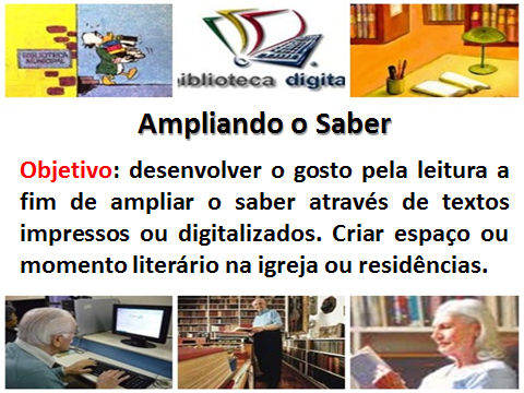 Ferramenta 04 – Ampliando o Saber. O objetivo é desenvolver o gosto pela leitura a fim de ampliar o saber através de textos impressos ou digitalizados; criar espaço ou momento literário na igreja ou residências.