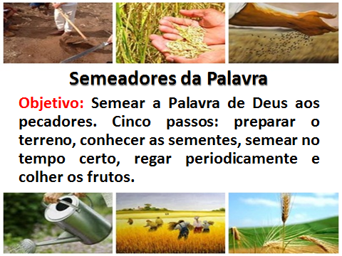 Ferramenta 01 – Semeadores da Palavra. O objetivo é semear a Palavra de Deus aos pecadores. Cinco passos: preparar o terreno, conhecer as sementes, semear no tempo certo, regar periodicamente e colher os frutos.