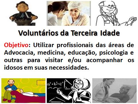 Ferramenta 09 – Voluntários da Terceira Idade. O objetivo desta ferramenta é utilizar os profissionais liberais membros da igreja das áreas de advocacia, medicina, educação, psicologia e outras para visitar e/ou acompanhar os idosos em suas necessidades sem ônus para os mesmos. Como a pessoa idosa é muito agradecida certamente àqueles que se envolverem com essa ferramenta terão seus nomes lembrados nas orações.