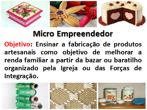 Ferramenta 03 – Micro Empreendedor. O objetivo é ensinar a fabricação de produtos artesanais como objetivo de melhorar a renda familiar a partir de bazar ou baratilho organizado pela Igreja ou das Forças de Integração.
