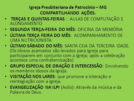 Ferramenta 10 – Compartilhando Ações: Igreja Presbiteriana de Patrocinio – MG. Um dos objetivos da Rede Presbiteriana de Apoio à Pessoa Idosa (REPAPI) é a troca de experiências.